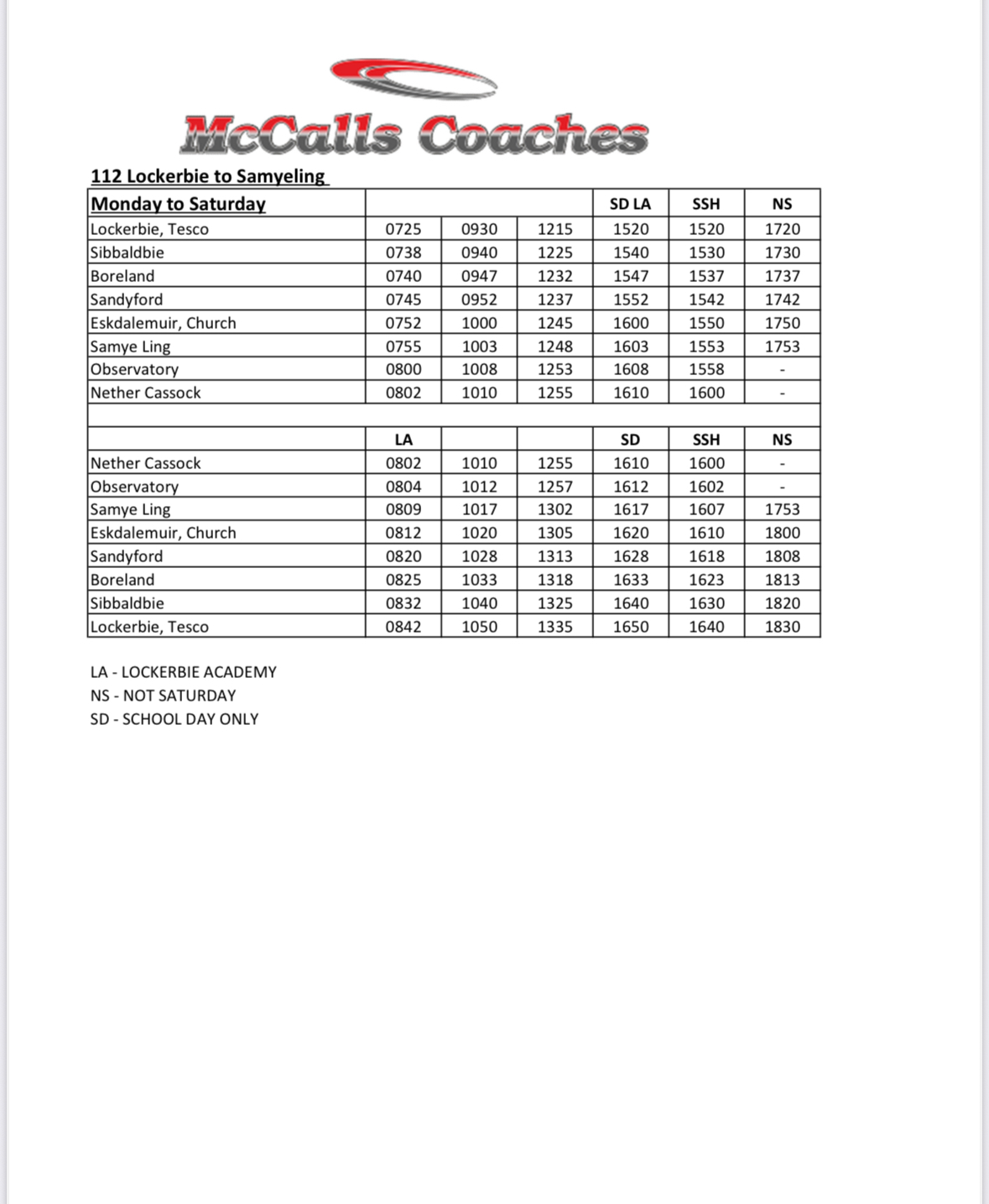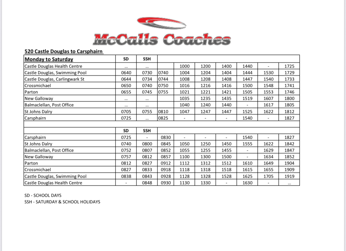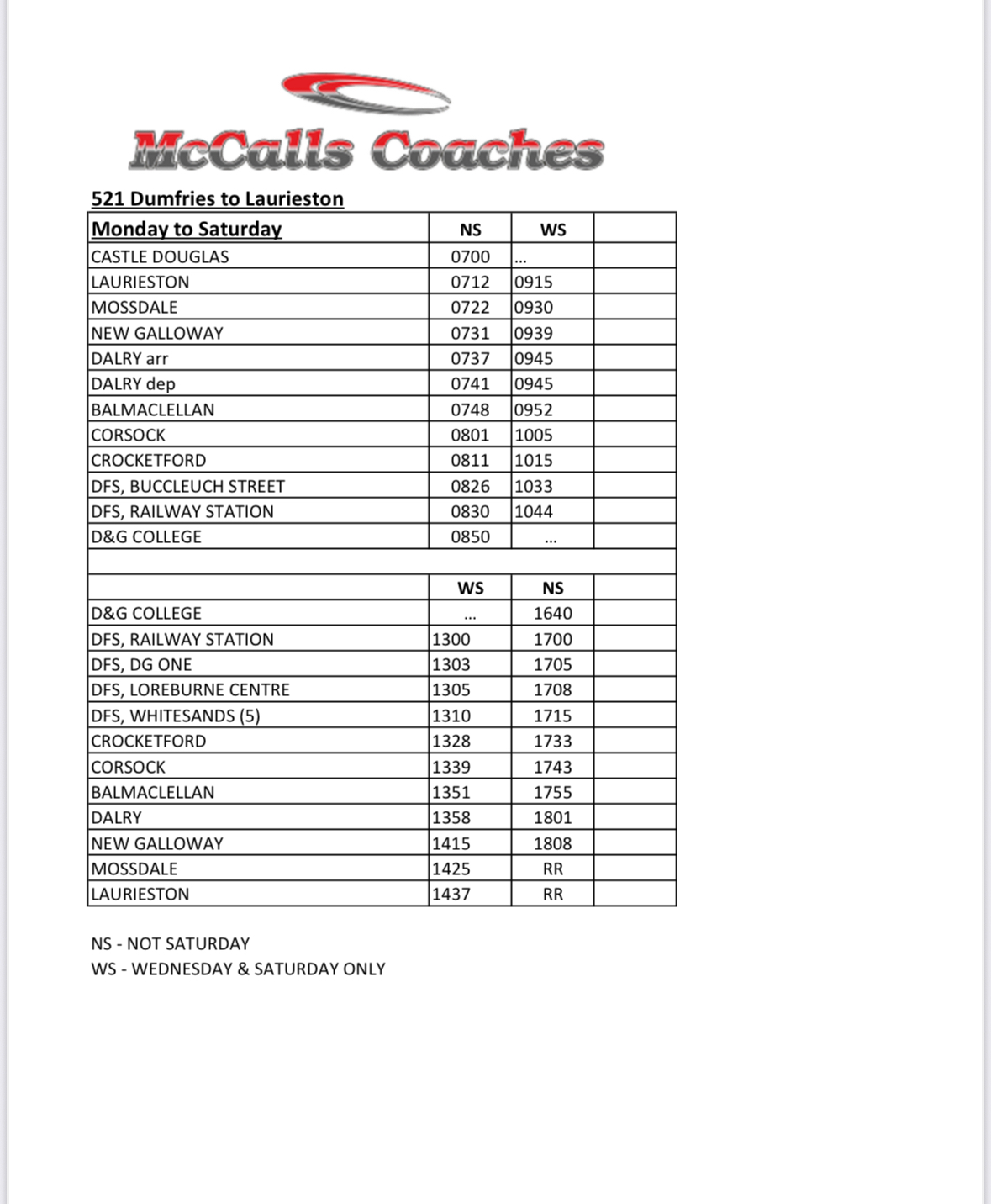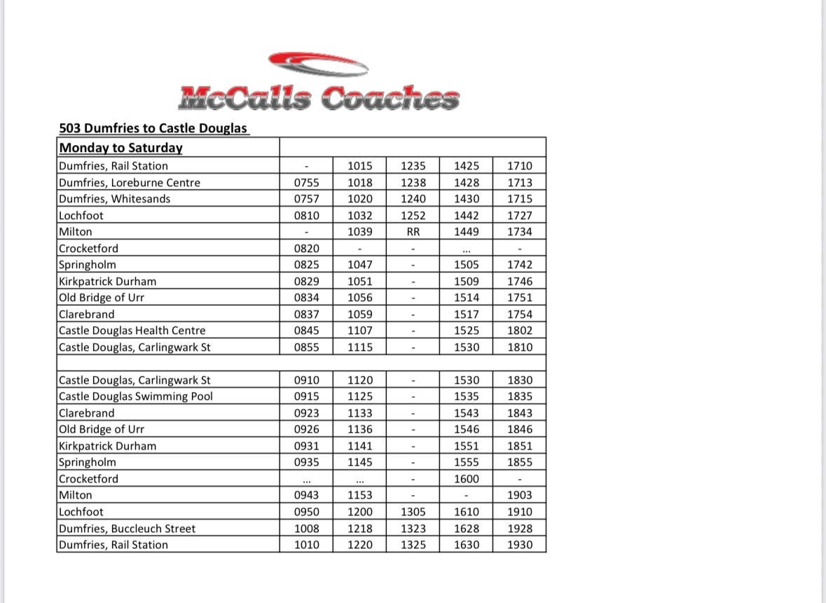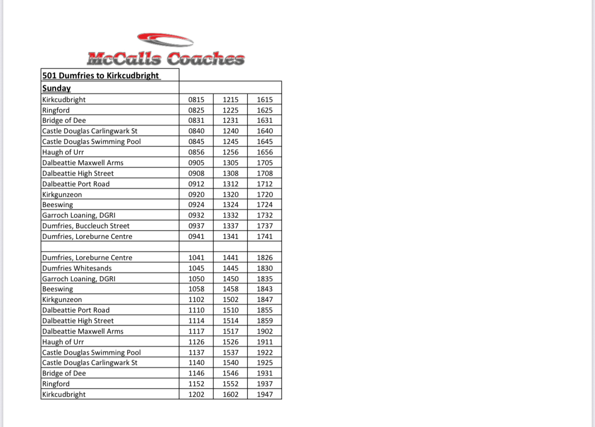 McCalls Coaches Timetables Dumfries to Laurieston (521) Castle Douglas to Carsphairn (520) Kirkcudbright to Dalbeattie (505) Dumfries to Castle Douglas (503) Kirkcudbright to Castle Douglas (502) Dumfries to Kirkcudbright - Mon - Sat (501) Dumfries to Kirkcudbright - Sunday (501) Kirkcudbright to Gatehouse (431) Dumfries to Annan (385) Lockerbie to Annan - Saturday only (383) Dumfries to Lochmaben - Mon - Sat (381) Dumfries to Cumnock (246) Lockerbie to Hightae (117) Lockerbie to Samyeling (112)